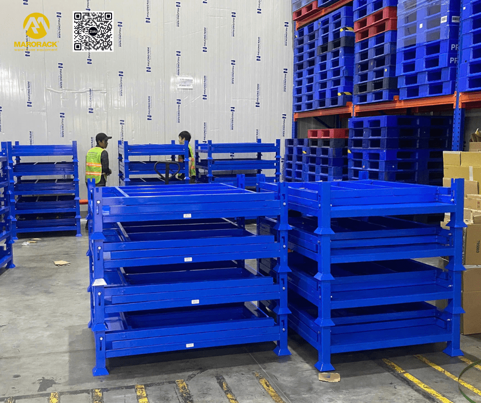 👉 Nói cách khác: Nestainer là sự kết hợp giữa pallet và kệ chứa hàng, giúp tận dụng chiều cao kho lạnh mà vẫn dễ dàng di chuyển.